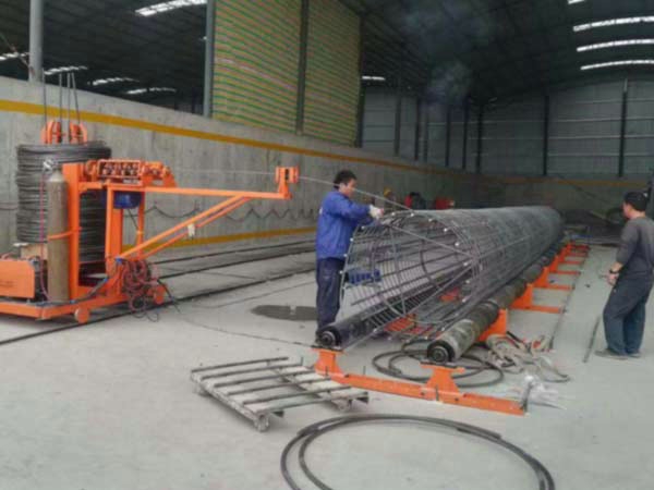 2、鋼筋籠12米以上,或者單節(jié)鋼筋籠較重時,骨架中間加焊1、2圈纏繞筋替代第三個過渡箍。或直接中間開始繞筋,另半截籠前面向中間纏繞連接完成。所以三個過渡箍的中間一個箍應(yīng)置放在中間靠后面的地方,借以減少沖擊振動。退出輥輪并過渡到后面輥輪的方法--將過渡箍向后面推壓,讓過渡箍順膠輥旋轉(zhuǎn)到上面直到全部退出。準(zhǔn)備臺架;若采用骨架直接滾進輥輪內(nèi)檔(小型鋼筋籠),骨架制作臺架高度與設(shè)備同高。